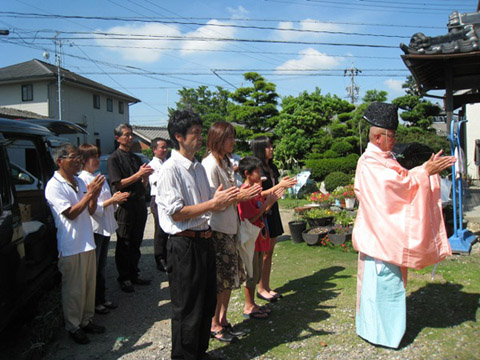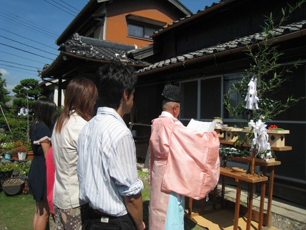 雲ひとつない真夏の晴天のこの日、棟続きに住むご両親、ご家族5人、豊田の恊友建築の梶社長、夢千年の暮らしプロデュース&デザインのスタッフたち、設計の祝迫さんの列席のもとで、古式にのっとっておごそかな祈願祭となりました。