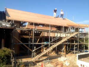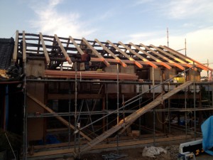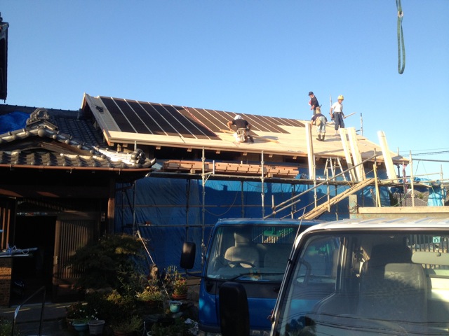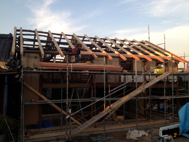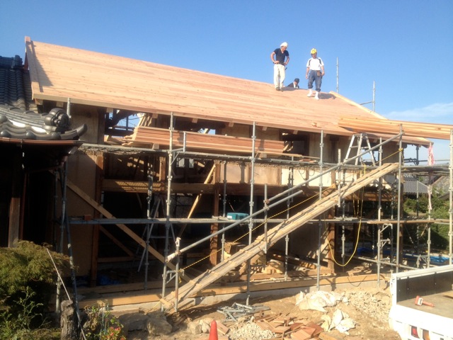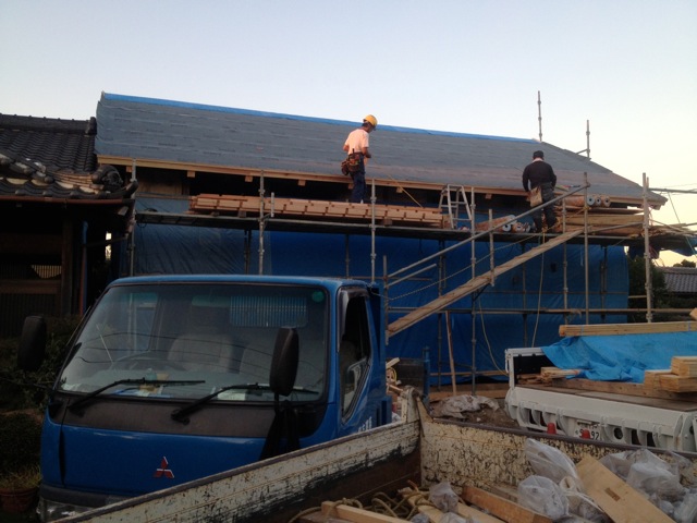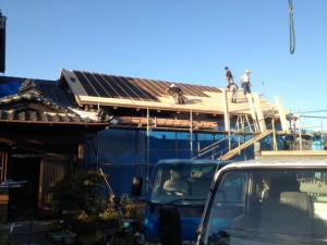 台風が来る前に急ピッチで屋根工事です。見違えるほどがっしりした構造になりました!