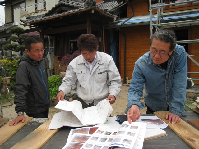 Sさんご家族はこの間懸命に家造りに励んできました。そんなみなさんのあつーい気持ちはプロデューサー にも設計者にも棟梁にもひしひしと伝わってきます。 良い家造りはこの熱いチームワークあってこそ! いい家になりました。 5月半ばには完成です! 内装も大詰め、いよいよ部材確認に力が入ります