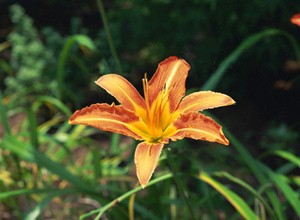 分布は中国、朝鮮半島、日本、サハリン。日本では本州以南の原野などに群生する多年草で、冬季には地上部分の葉が枯れます。草丈は約80㎝ほどで、葉の幅は狭く長く、花は大きく一重のユリに似た赤みがかったオレンジ色で、6枚の花びらをもち、6月下旬から8月に開花します。