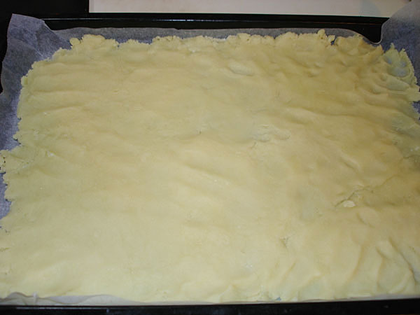 3. ひとまとめにして、オーブンシートを敷いた型に、3の生地を均一に敷きつめます。手で押さえて平らにならします。