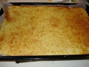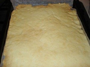 7. 焼きあがった5の上にフィリングを流しいれ170℃に温めておいたオーブンで焼き色が軽くつくまで約25~28分焼きます。