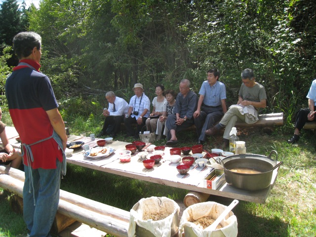 昼食は外の芝生の上にしつらえた永ーいテーブルで、秋の味覚の栗おこわ、五目おこわ、野菜のかき揚げは校長の得意レシピ。