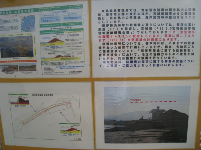 この海岸線に巨大な防波堤を築く計画が進んでいます。しかし、3.11を振り返っても防波堤が命や街を救ったとは思えません。それどころか防波堤があることで人の力を過信してたくさんの悲劇が生まれました。今回の「海べの森創り」プロジェクトはいずれ壊れてゴミとなるコンクリートの防波堤ではなく、ガレキで山をつくり、そこに植樹して自然の力によって災害を少しでも小さくしようというこころみです。「明日は我が身の桜ライン」もこの考え方に賛同して参加しました。自然植生の森に私たちの千年桜も加わります。