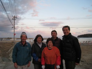 志津川湾を望む本吉郡南三陸町戸倉水戸辺で現地のリーダー松岡さんと工藤さんと14時46分 黙祷