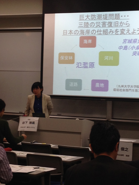 11月12日に、やはり東京の大学キャンパスの日本土木学会主催の防潮堤を巡るセミナーで清野さんがパネラーのひとりというのでまた出かけて行きました。ここでもピカイチの存在!