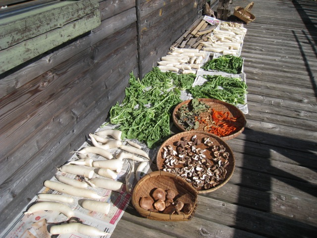 風が無かったせいもあって今年の紅葉はじつに見応えがありました。しかし12月に入ったとたん気温がぐーんと下がり朝の外気温はマイナス4~5度となりいよいよ本格的な冬の到来です。 そろそろ大根やら人参やら9月から育てていた野菜たちの収穫期になった・・・と思った矢先、連夜鹿が出没! 地上部の葉はもちろんのこと本体まですっかりほってやられました! 番犬ジョイちゃん、しっかりしなさい! わずかに残った大根を干しています。ナスの葉、柿の皮、みかんの皮など一緒に干して1週間ほどしたら「たくわん」漬け始めます。