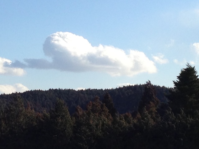 とにかくこの冬はさむかった・・・と言いたいのにまだまだ寒さは続きます。そして雪あり、雨あり、 地面はいつも湿っています。これも春の芽吹きの準備と言っておきましょうか・・・ 久しぶりにお日様に出会ったと思う間にすぐ雲がでてきます。 林の上にねこちゃんの様な、ライオンのような雲が・・・・おもわずパチリと撮りました。 春近しののどかな景色です。 飼っている2頭のヤギたちが春には赤ちゃん生みます。たのしみだな!