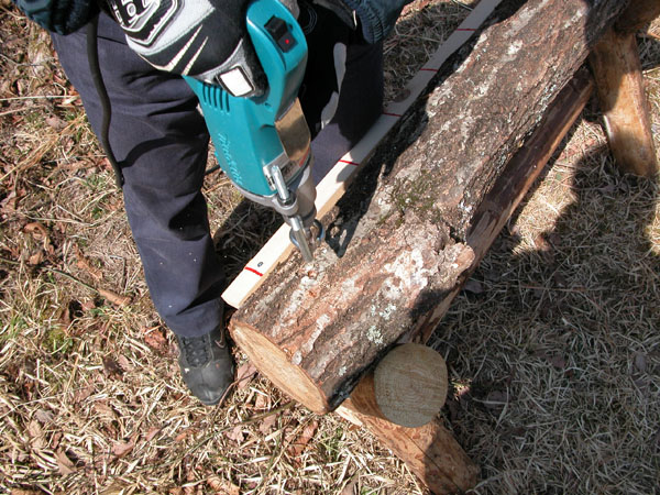 10cm間隔でほだ木に穴開け。