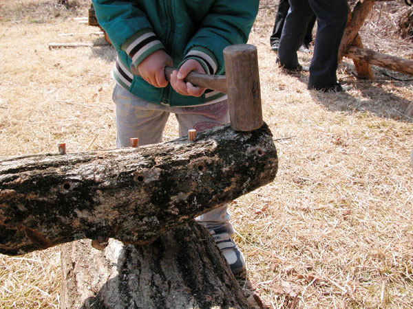 菌を打ち込む穴をほだ木に空けるための台。