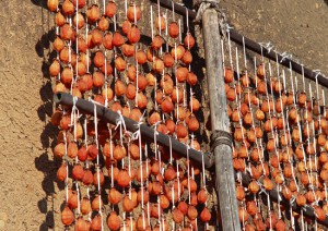 皮をむき、ヘタの部分にヒモをくくりつけて、家の軒下などに吊るします。自然乾燥させて甘くするのです。