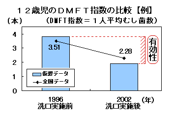 一般にフッ化物洗口の有効性を表すために使用される図表を例に考えて見ましょう。ある学校でDMFT指数が1996年時点(洗口未実施)で全国データ(文部科学省の学校保健統計調査データを線グラフで図示)よりも多く、洗口を実施して6年後に同年齢で比較したとき、全国平均を下回り、フッ化物洗口の効果があったとする図表です。多少の数値の違いはあっても、このようなデータが多く使われています。