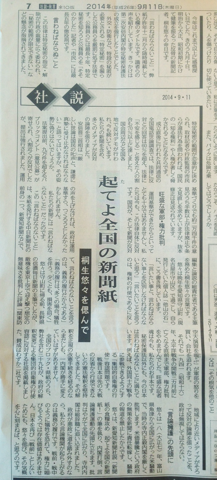 中日新聞(東京新聞) 9月11日 社説より
